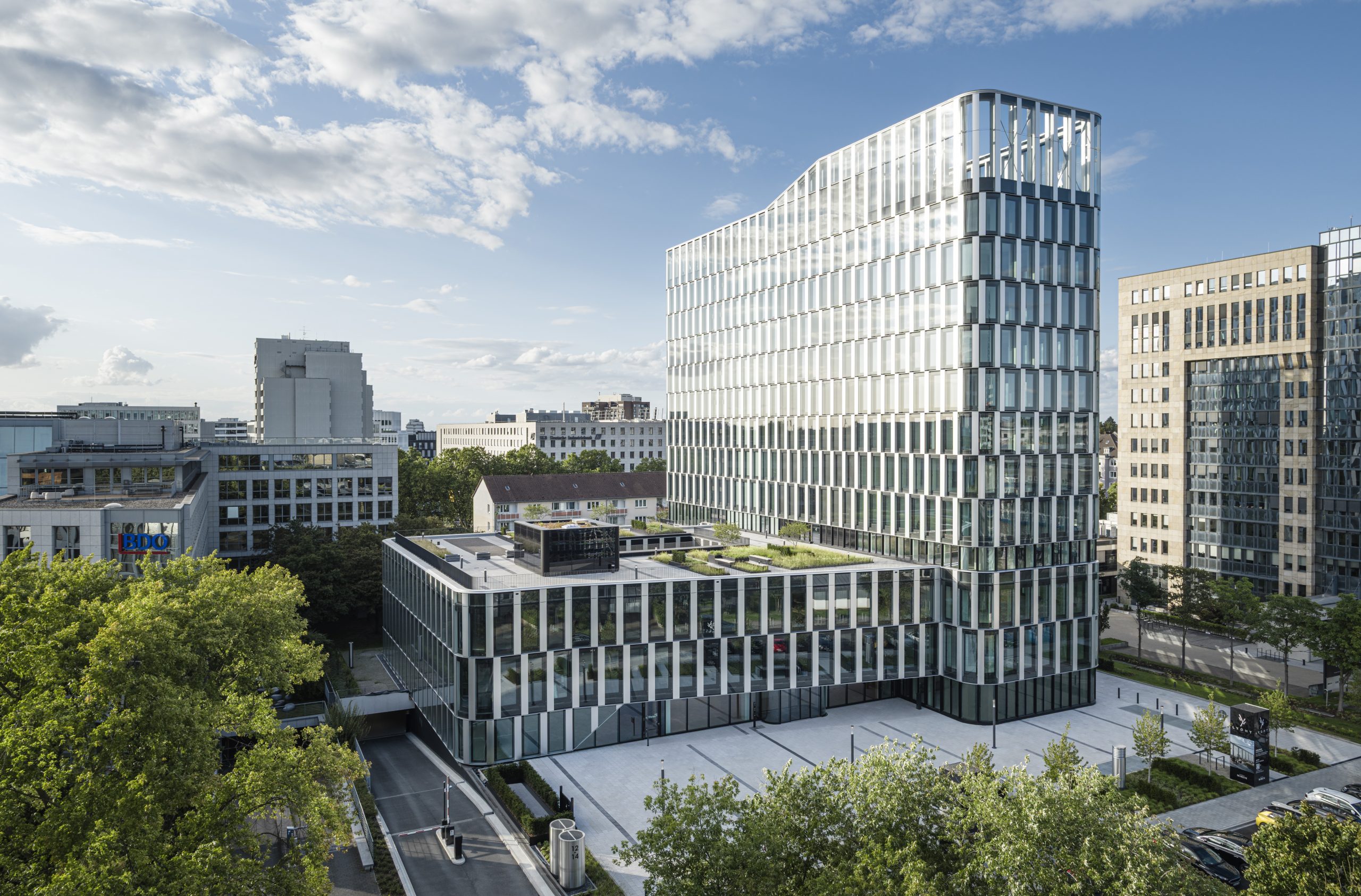 Begrünte Außenbereiche: grüner Patio, großflächige Dachterrasse im 3. OG und Sky-Garden mit Cityblick im 12. OG